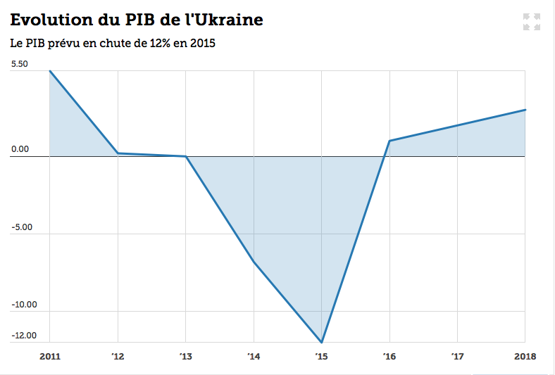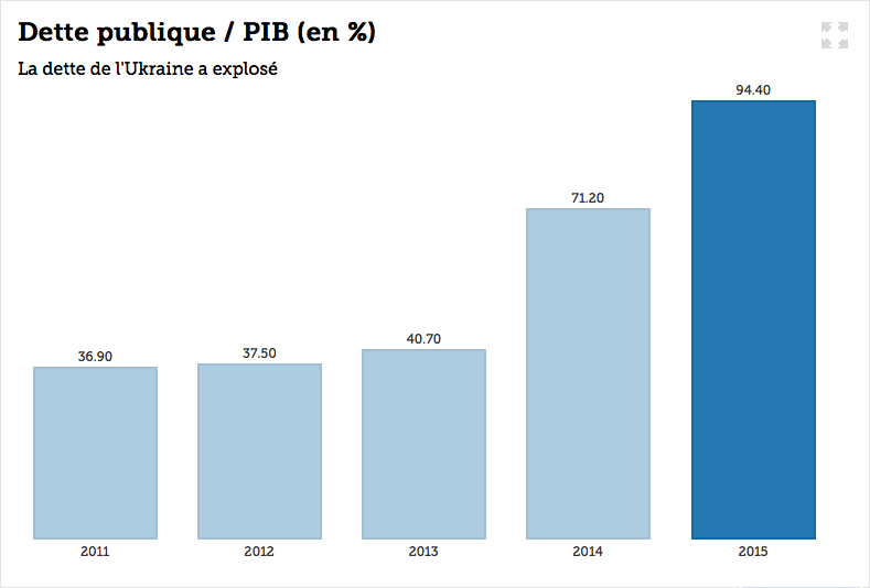 Mais cet accord d’août 2015 n’a pas effacé la dette que le pays avait contracté en 2013 (sous l’ère du pro-russe Viktor Ianoukovitch) auprès de la Russie, qui atteint 3 milliards de dollars avec échéance au 20 décembre 2015. Or, ces derniers mois, la situation économique du pays s’est encore empirée: la contraction du PIB en 2015 devrait finalement atteindre 12%, quand l’inflation frôle les 50%, plombant le portefeuille des Ukrainiens. La monnaie (la hryvnia) s’enfonce dans les abysses, renchérissant la partie de la dette publique libéllée en devises étrangères, et engloutissant les réserves de change. Tout indique que la dette explose au-delà des précédentes estimations à 95% du PIB. L’Ukraine reste privée de sa richesse industrielle à l’est du pays, les réformes tardent à se mettre en place, et si le niveau de corruption a baissé, les oligarques ont encore la main sur des pans entiers de l’économie.